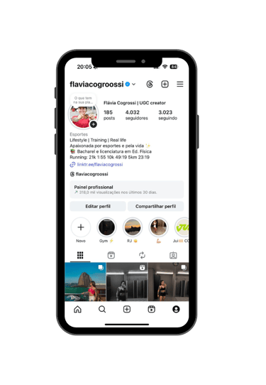 Transformo rotinas em conexão. O conteúdo que crio nasce da minha vivência real com o esporte, com bem-estar e com os produtos que uso de verdade, no treino, na rua, no dia a dia.